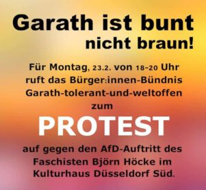Für Montag, 23.2. von 18-20 Uhr ruft das Bürger:innen-Bündnis Garath-tolerant-und-weltoffen zum PROTEST auf gegen den AfD-Auftritt des Faschisten Björn Höcke im Kulturhaus Düsseldorf Süd. Treffpunkte: Nikolaus-Groß-Platz (vor dem Kulturhaus) Platz vor dem Anne-Frank-Haus Cl.-von- Brentano- Platz im Hauptzentrum, Dietrich-Bonhoeffer-Platz und…